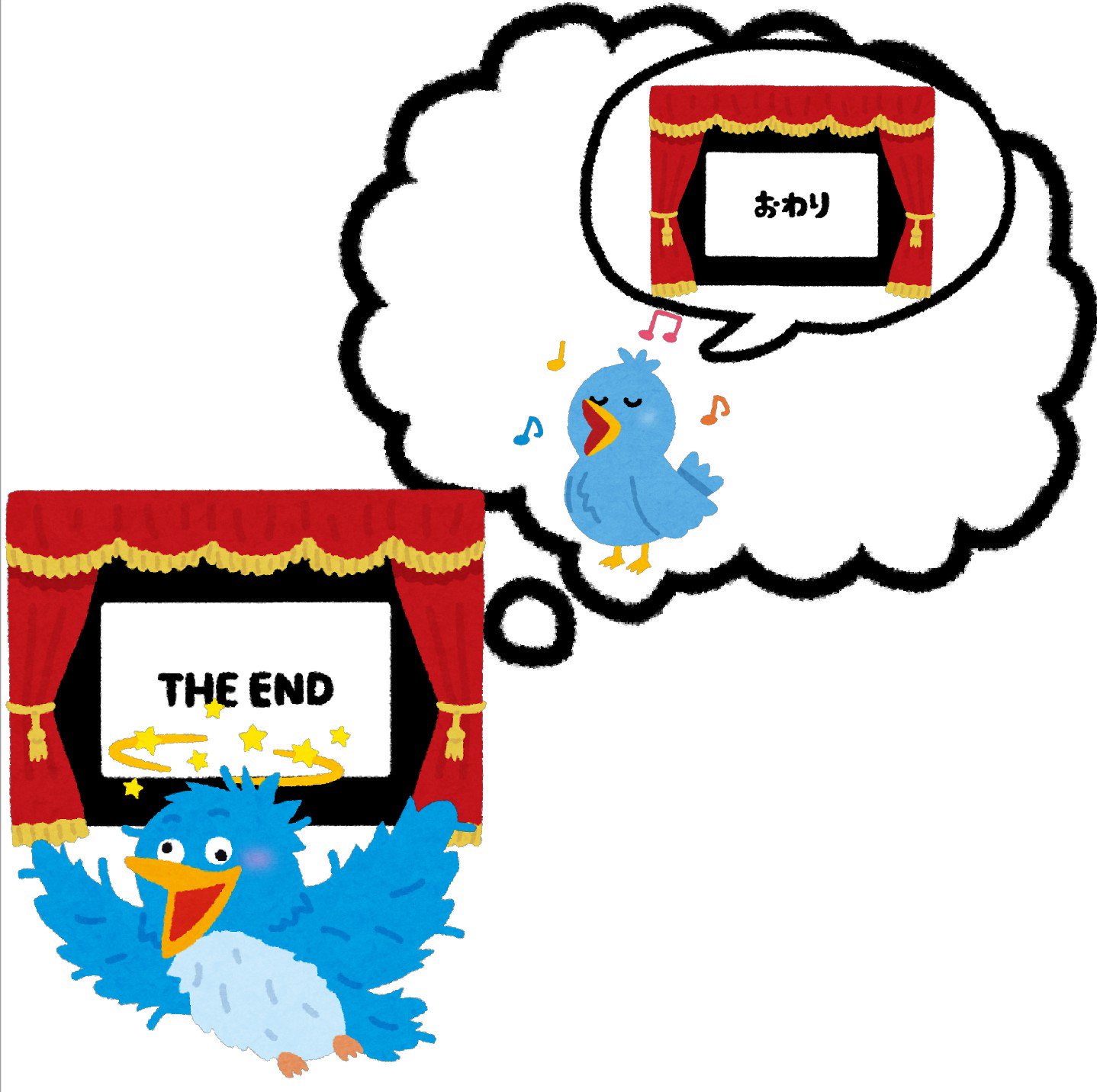 まいチクをいらすとやで再現 Ar Twitter 再現難易度 使ったイラスト 6枚 ふきだしのイラスト 映画の おしまい のイラスト おわり The End 歌う鳥のカップルのイラスト 右向きの水色の小鳥 頭の悪い青い鳥のイラスト まいにちチクショー T Co Fqkol9fuji